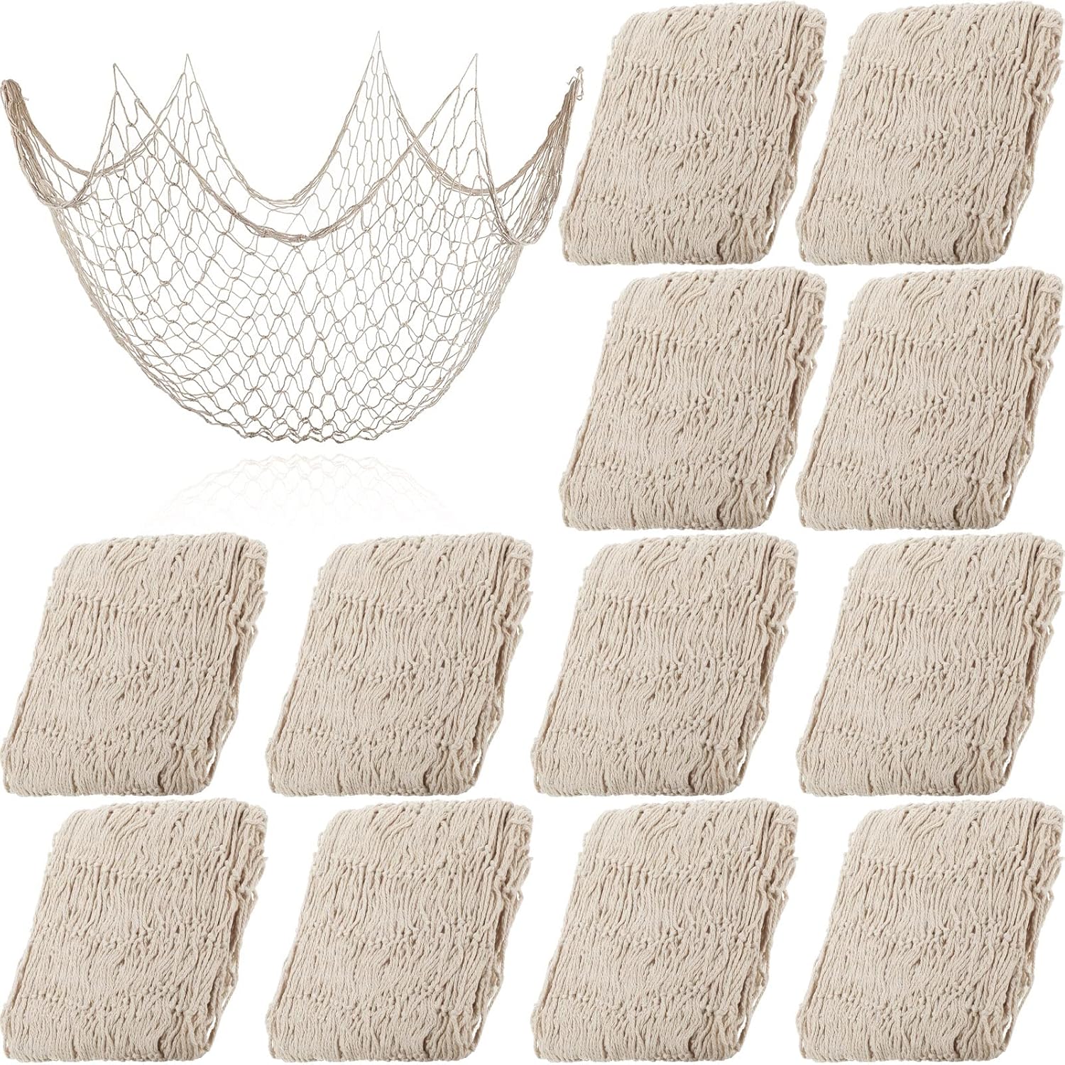 Chumia 12 Pcs Fish Net Decorative Hanging Party Supplies 78.7 x 59 Inch Nautical Party Decorations Natural Cotton Fishnet Accessory for Hawaiian Pirate Fishing Theme Supplies (Beige)